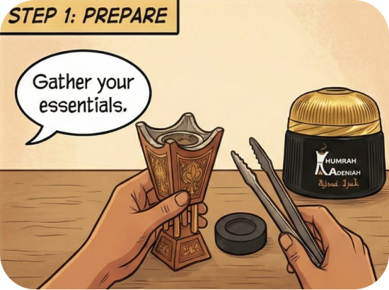 The initial step is to gather all necessary items: a decorative incense burner, a charcoal disc, the incense (like Khumrah Adeniah), and a pair of tongs for safe handling.