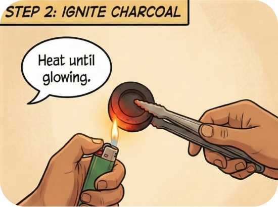 Using the tongs, securely hold the charcoal disc and apply a direct flame until it glows red hot. This signals it is fully ignited and ready.