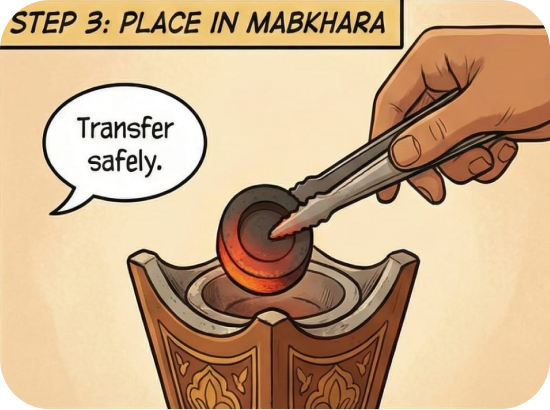 Carefully use the tongs to transfer the red-hot charcoal disc and safely place it inside the mabkhara (incense burner).