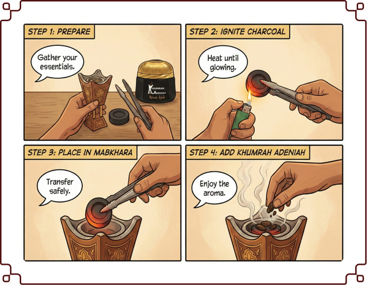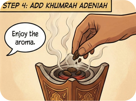 Place a small amount of Khumrah Adeniah incense onto the glowing charcoal inside the mabkhara to release the fragrant smoke and enjoy the aroma.